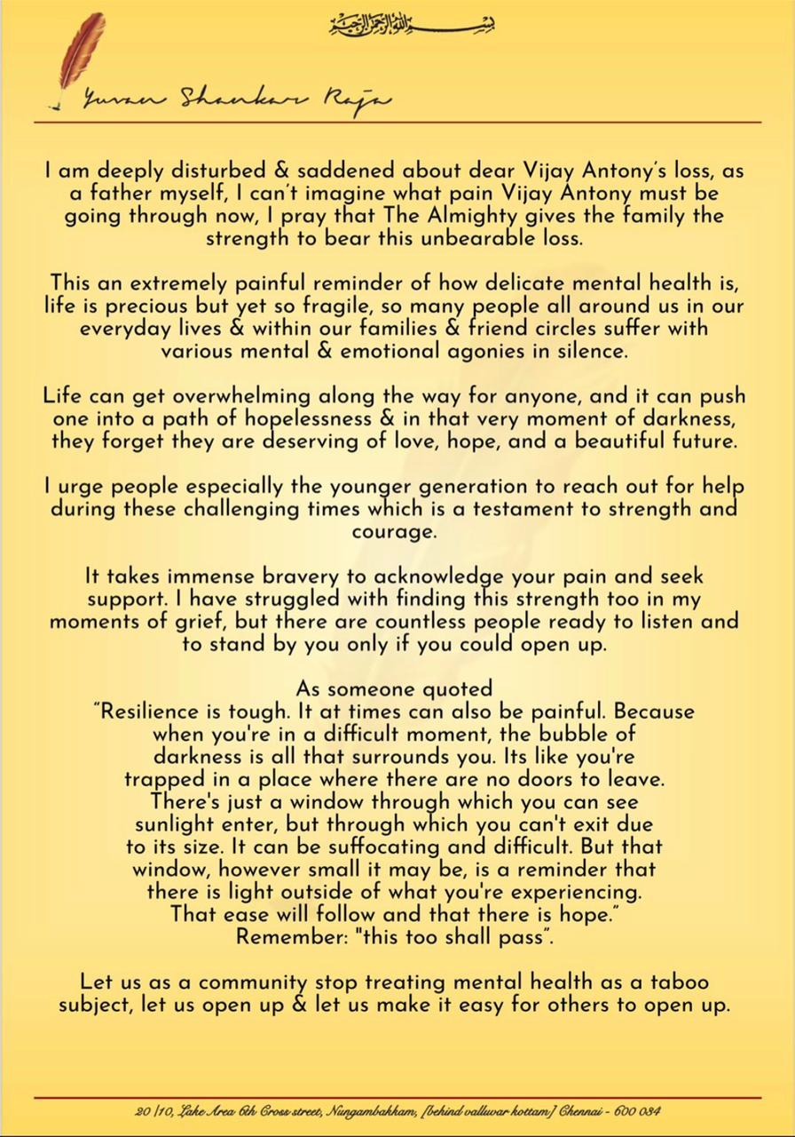 அந்த வகையில் இசையமைப்பாளர் யுவன் சங்கர் ராஜா தனது ட்விட்டர் பக்கத்தில்,” விஜய் ஆண்டனியின் இழப்பை நினைத்து நான் மிகவும் கவலைப்படுகிறேன். ஒரு தந்தையாக விஜய் ஆண்டனி இப்போது என்ன வேதனையை அனுபவித்துக் கொண்டிருக்கிறார் என்பதை என்னால் கற்பனை செய்து பார்க்க முடியவில்லை. இந்த தாங்க முடியாத இழப்பை அந்தக் குடும்பத்தினர்