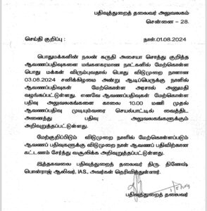 இதுதொடர்பாக பதிவுத்துறை தலைவர் வெளியிட்டுள்ள செய்திக்குறிப்பில், பொதுமக்களின் நலன் கருதி அசையா சொத்து குறித்த ஆவணப்பதிவுகளை மங்களகரமான நாட்களில் மேற்கொள்ள பொது மக்கள் விரும்புவதால் பொது விடுமுறை நாளான ஆகஸ்ட் 3ஆம் தேதி சனிக்கிழமை அன்று ஆடிப்பெருக்கு நாளில் ஆவணப்பதிவுகள் மேற்கொள்ள அரசால் அனுமதி வழங்கப்பட்டுள்ளதாக தெரிவிக்கப்பட்டுள்ளது.