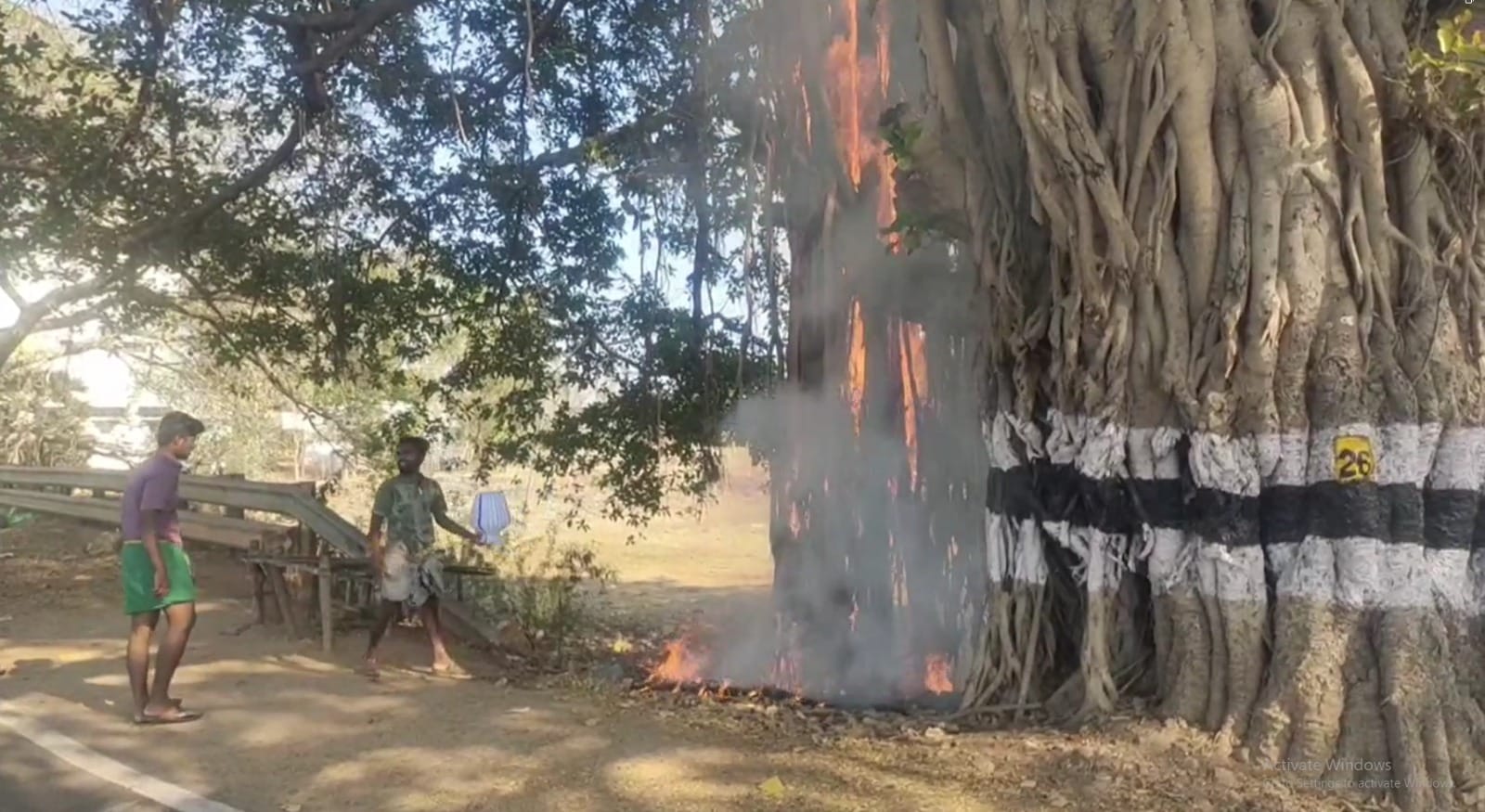 இந்நிலையில் அந்த மரத்தில் திடீரென்று தீப்பற்றி எரிந்தது. மளமளவென பரவிய தீ மரத்தின் ஒரு பகுதியில் கொழுந்துவிட்டு எரிந்தது. இதை கவனித்த கண்ணன் என்ற இளைஞர் தீயை அணைக்க முயற்சி மேற்கொண்டார். மேலும் அரசு பள்ளியில் 8ம் வகுப்பு மாணவனான தமிழ்செல்வனும் இதற்கு முன்னர் தீயை அணைக்க போராடியுள்ளான்.