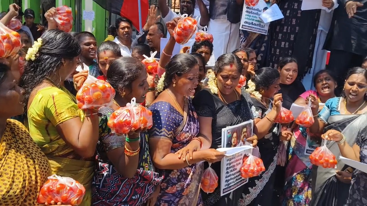 இதனைத் தொடர்ந்து தங்கத்தையும் தக்காளியும் கையில் வைத்து அத்தியாவசிய பொருளான தக்காளியின் விலை உச்சத்தை தொட்டுள்ளதால் தங்கத்தை கூட வாங்கி விடலாம் தக்காளியை வாங்க முடியாது நிலை ஏற்பட்டுள்ளதை எடுத்துரைத்தனர். அனைவருக்கும் தக்காளியை வழங்கி தக்காளியை வைத்து கண்டன ஆர்ப்பாட்டத்தில் ஈடுபட்டனர்.