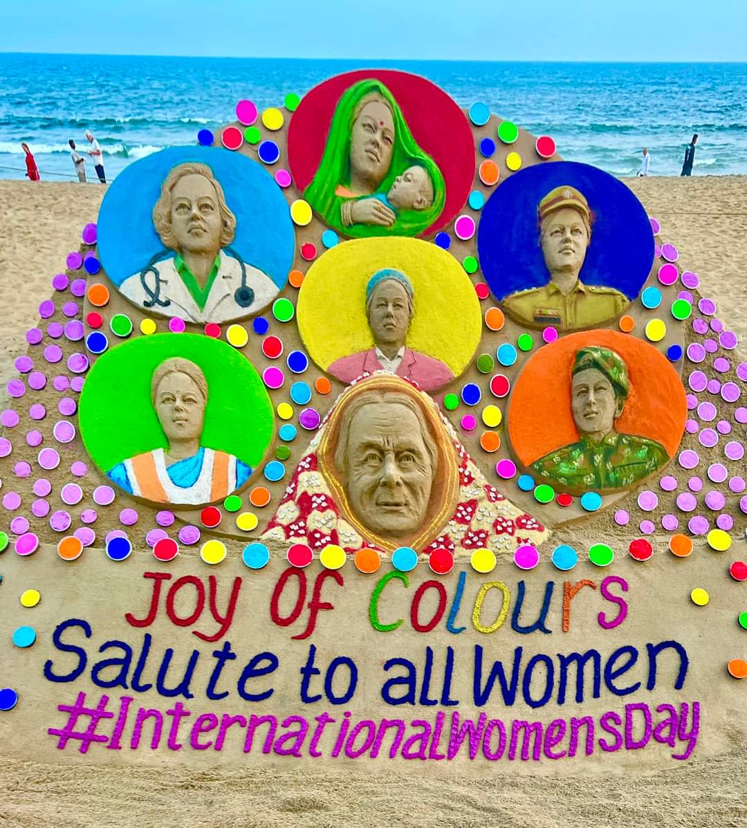 மகளிர் தினத்தையொட்டி பெண்களை கொண்டாடும் வகையில் பிரபல மணல் சிற்ப கலைஞர் சுதர்சன் பட்நாயக் உருவாக்கிய சிற்பம் அனைவரையும் கவர்ந்தது. ஒடிசா மாநிலம் பூரி கடற்கரையில் அனைத்து துறைகளிலும் மகளிர் ஈடுபட்டு வருவதை விளக்கம் வகையில் மணல் சிற்பத்தை அவர் உருவாக்கினார். ஹோலி பண்டிகையும் இன்று கொண்டாடப்படுவதால், பல வண்ணங்களை வைத்து அவர் மணல் சிற்பத்தை உருவாக்கி இருந்தார்.