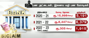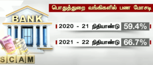 2022 – 2023 ஆம் நிதி ஆண்டு செப்டம்பர் மாதம் வரையில் வழக்கு பதிவு செய்யப்பட்ட வங்கி பரிவர்த்தனை மோசடிகள் பண மோசடிகள் குறித்த விவரங்களை இந்திய ரிசர்வ் வங்கி வெளியிட்டுள்ளது. அதன்படி பொதுத்துறை வங்கிகளில் 2020 – 2021 ஆம் நிதியாண்டில் 59.4 சதவிகிதமாக இருந்த பண பரிவர்த்தனை மோசடி வழக்குகள் 2021 – 2022 நிதியாண்டில் 66.7 சதவிகிதமாக உயர்ந்தது என குறிப்பிட்டுள்ளது ரிசர்வ் வங்கி நடப்பு நிதி ஆண்டில் இது மேலும் அதிகரித்துள்ளதாக கூறியுள்ளது.