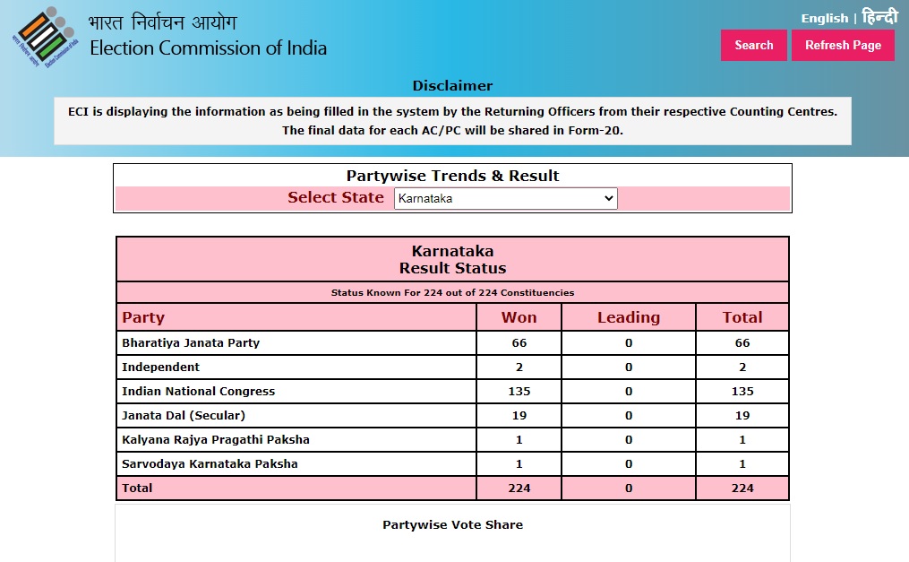 பதிவான வாக்குகளை எண்ணும் பணி மே 13- ஆம் தேதி அன்று காலை 08.00 மணிக்கு தொடங்கிய நிலையில், இரவு வரை நீடித்தது. இந்த நிலையில், 224 தொகுதிகளில் எந்தெந்த கட்சிகள் எத்தனை தொகுதிகளில் வெற்றி பெற்றுளளன என்பது குறித்த முழு பட்டியலையும் இந்திய தலைமைத் தேர்தல் ஆணையம் வெளியிட்டுள்ளது.