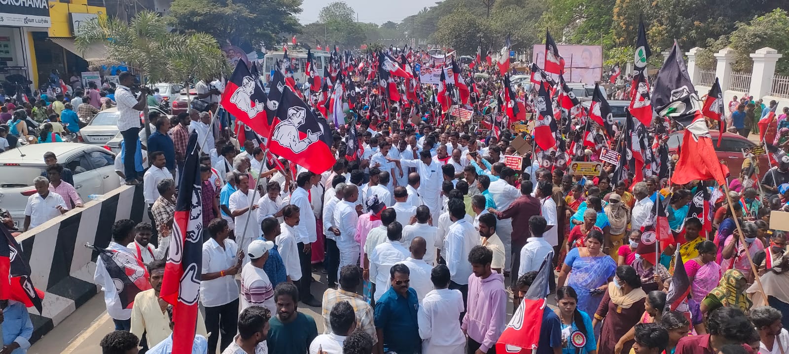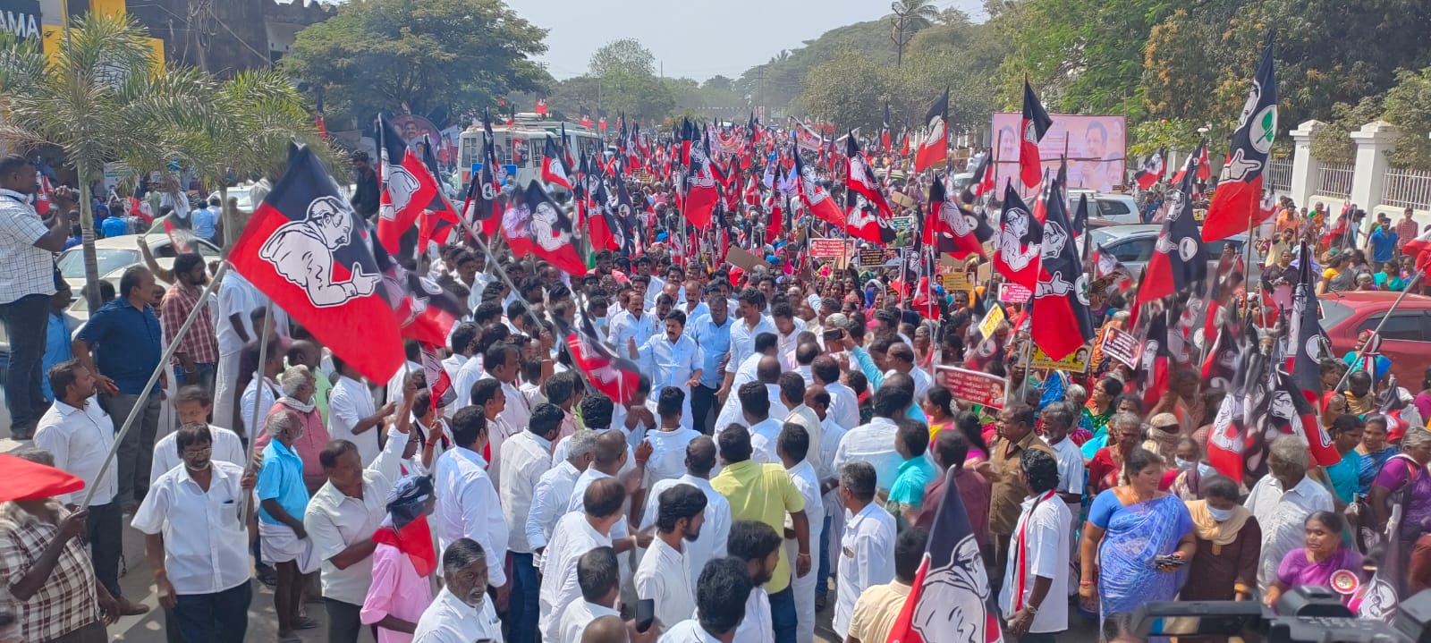 புதுச்சேரியில் அதிமுக சார்பில் நடைபெற்று வரும் மாபெரும் பேரணி ஆர்ப்பாட்டத்தில் முன்னாள் அமைச்சர் சிவி சண்முகம் எம்பி தலைமையில் 5000-க்கும் மேற்பட்ட அதிமுகவினர் பங்கேற்றனர்.