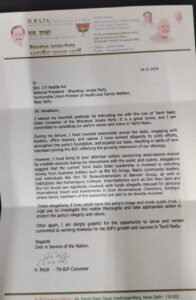 இதில் நம் கட்சி தலைவரின் தலைமையின் குடும்ப உறுப்பினர்கள் நேரடியாக ஈடுபட்டுள்ளனர். இந்தக் குற்றச்சாட்டுகள் உண்மையாக இருந்தால், கட்சியின் நற்பெயருக்குக் கேடு விளைவித்து, மக்களின் நம்பிக்கையை சிதைத்துவிடும். இந்த விவகாரத்தை முழுமையாக விசாரித்து, உரிய நடவடிக்கை எடுக்குமாறு கேட்டுக்கொள்கிறேன். மீண்டும், தமிழகத்தில் பாஜகவின் வளர்ச்சி, வெற்றிக்காக அயராது உழைக்க அர்ப்பணிப்புடன் பணியாற்றும் வாய்ப்புக்கு எனது மனமார்ந்த நன்றியைத் தெரிவித்துக் கொள்கிறேன்” எனக் குறிப்பிடப்பட்டிருந்தது.