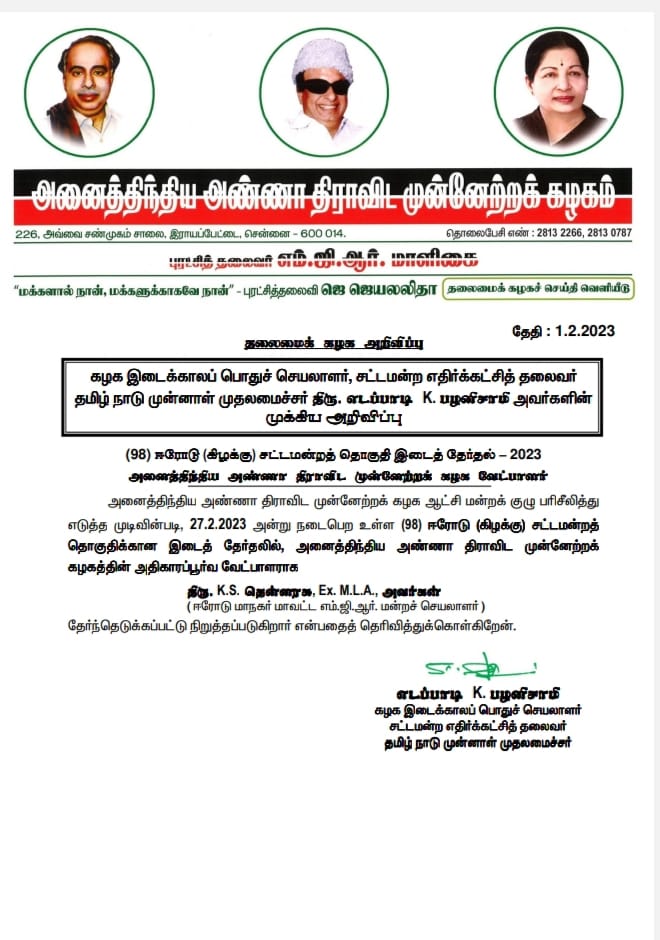 எடப்பாடி பழனிசாமி வெளியிட்டுள்ள செய்தி குறிப்பில், அனைத்திந்திய அண்ணா திராவிட முன்னேற்றக் கழக ஆட்சி மன்றக் குழு பரிசீலித்து எடுத்த முடிவின்படி, 27.02.2023 அன்று நடைபெற உள்ள (98) ஈரோடு கிழக்கு சட்டமன்றத் தொகுதிக்கான இடைத்தேர்தலில், அனைத்திந்திய அண்ணா திராவிட முன்னேற்றக் கழகத்தின் அதிகாரப்பூர்வ வேட்பாளராக கே.எஸ்.தென்னரசு அவர்கள் தேர்ந்தெடுக்கப்பட்டுள்ளார் என்பதை தெரிவித்துக்கொள்கிறேன் என்று கூறியுள்ளார்.