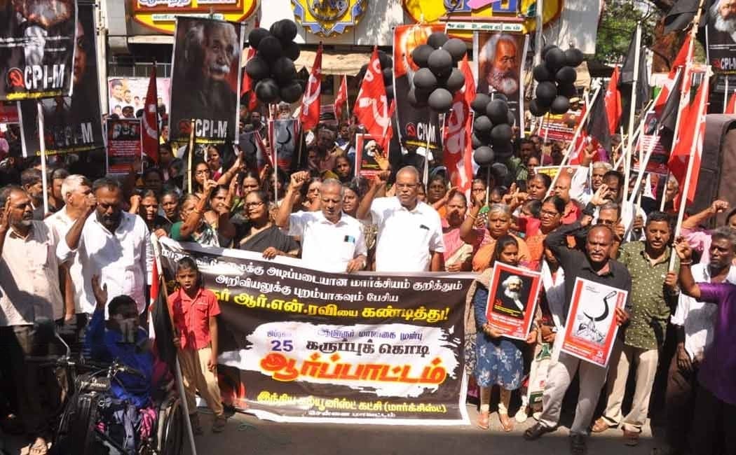 மார்க்சியம் குறித்த தமிழ்நாடு ஆளுநர் ரவியின் பேச்சைக் கண்டித்து மார்க்சிஸ்ட் கம்யூனிஸ்ட் கட்சியின் சார்பில் சென்னை சைதாப்பேட்டையில் கருப்புக் கொடி காட்டி ஆர்ப்பாட்டம் நடைபெற்றது.