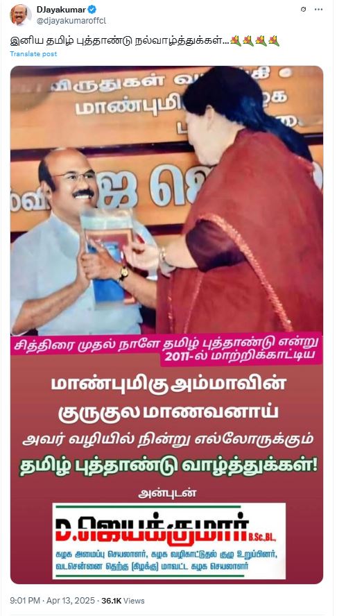 இந்நிலையில் தான் அவர் தமிழ்ப் புத்தாண்டு பிறப்பை ஒட்டி வெளியிட்டிருக்கும் வாழ்த்து பதிவு அவர் பொதுச் செயலாளர் எடப்பாடி பழனிசாமியின் மீது அதிருப்தியில் உள்ளதை வெளிப்படுத்தி உள்ளது. கடந்தாண்டு ஈபிஎஸ் படத்துடன் தமிழ்ப் புத்தாண்டு வாழ்த்து தெரிவித்திருந்த ஜெயக்குமார், இந்தாண்டு அதனை தவிர்த்து விட்டு முன்னாள் முதலமைச்சர் ஜெயலலிதாவின் படத்துடன் எக்ஸ் தளத்தில் வாழ்த்து செய்தியை பதிவிட்டுள்ளார். அதில், அம்மாவின் குருகுல மாணவனாய் அவர் வழியில் நின்று எல்லோருக்கும் தமிழ்ப் புத்தாண்டு வாழ்த்துக்கள் என்று ஜெயக்குமார் குறிப்பிட்டுள்ளார். அதிமுகவில் ஏற்கெனவே எடப்பாடி பழனிசாமியின் மீது முன்னாள் அமைச்சர் செங்கோட்டையன் அதிருப்தியில் இருப்பதாக கூறப்பட்டு வருகிறது. இந்நிலையில், தற்போது அவரது தீவிர ஆதரவாளரான ஜெயக்குமாரும் அதிருப்தியில் உள்ளாரா? என கேள்வி எழுந்துள்ளது.