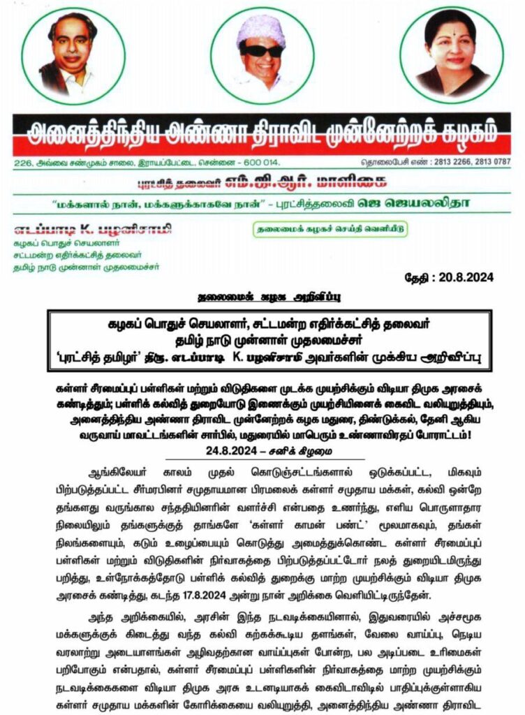 கள்ளர் சீரமைப்புப் பள்ளிகளை, பள்ளிக்கல்வித் துறையோடு இணைக்க எதிர்ப்பு தெரிவித்து அதிமுக சார்பில் வரும் 24ஆம் தேதி மதுரை மாவட்டம்செக்கானூரணியில் மாபெரும் உண்ணாவிரத போராட்டம் நடைபெறும் என அக்கட்சியின் பொதுச் செயலாளர் எடப்பாடி பழனிசாமி அறிவித்துள்ளார்.