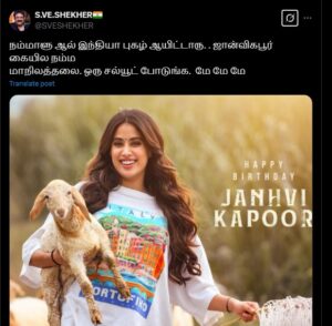 இந்நிலையில், எஸ்.வி.சேகர் தனது எக்ஸ்தளப் பதிவில், மறைந்த நடிகை ஸ்ரீதேவியின் மகள் ஜான்வி கபூர் ஒரு ஆட்டுக் குட்டியை கையில் வைத்தபடி உள்ள புகைப்படத்தைப் பகிர்ந்து ”நம்மாளு ஆள் இந்தியா புகழ் ஆயிட்டாரு…. ஜான்விகபூர் கையில நம்ம மாநிலத்தலை. ஒரு சல்யூட் போடுங்க. மே மே மே..” எனக் கலாய்த்துள்ளார்.