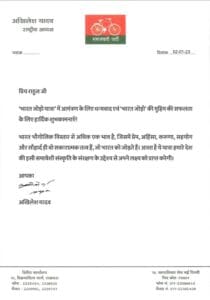 ராகுல்காந்தி தலைமையிலான இந்திய ஒற்றுமை யாத்திரை கடந்த செப்டம்பர் மாதம் தமிழகத்தின் கன்னியாகுமரியில் தொடங்கி 9 மாநிலங்களை கடந்து டெல்லியில் தற்போது உள்ளது. உத்திரபிரதேசம், பஞ்சாப் வழியாக ஜம்மு காஷ்மீர் வரை உள்ள மீதமுள்ள 447 கிலோ மீட்டர் தூரமுள்ள நடைபயணம் நாளை தொடங்கவுள்ள நிலையில், உத்திரபிரதேச மாநில சட்டமன்ற எதிர்க்கட்சி தலைவரும், சமாஜ்வாதி தலைவருமான அகிலேஷ் யாதவ் கடிதம் எழுதியுள்ளார்.