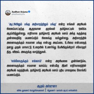 இந்நிலையில் மாநாடு முடிந்த சில மணி நேரங்களில், விசிக கட்சியின் துணைப்பொதுச் செயலாளர் ஆதவ் அர்ஜூன் தனது எக்ஸ் வலைதளப் பதிவில், ‘‘ஆட்சியிலும் பங்கு அதிகாரத்திலும் பங்கு’ என்ற எங்கள் அரசியல் நிலைப்பாட்டிற்கு ஆதரவான குரல்கள் தமிழ்நாட்டில் ஒலிக்க ஆரம்பித்துள்ளது. எதிர்கால தமிழ்நாடு அரசியல் களம் அந்த கருத்தை முன்வைத்தே பயணப்படும் நிலைக்கு வந்துள்ளது. அதிகாரத்தில் அனைவருக்கும் சமமான பங்கு என்பது அடிப்படை உரிமை என்பதைத் தனது முதல் மாநாட்டு உரையில் உணர்ந்து பேசியிருக்கிறார் சகோதரர் திரு. விஜய். அவருக்கு வாழ்த்துகள்.