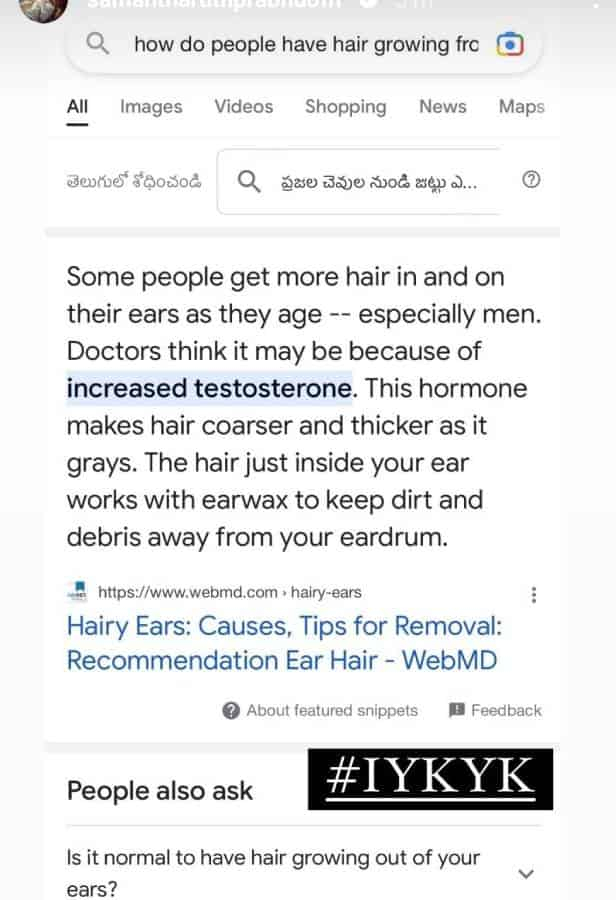 இந்நிலையில் சமந்தா தற்போது ஒரு பதிவு வெளியிட்டுள்ளார். “அதில் காதுகளில் அதிகம் முடி வளருவதற்கு ஆண்மைக்கான டெஸ்டிரோன் அதிகரிப்பது தான் காரணமாக இருக்கும்” என்று கூகுள் காண்பித்த பதிலை ஸ்க்ரீன்ஷாட் எடுத்து ஸ்டேட்ஸில் வைத்துள்ளார்.