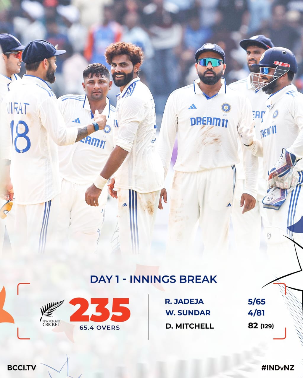 எனினும் வில் யங் மற்றும் டேரில் மிட்செல் இணை சற்று தாக்குப்பிடித்து ரன்களை சேர்த்தனர். சிறப்பாக ஆடிய இருவரும் அரை சதம் அடித்து ஆட்டமிழந்தனர். பின்னர் வந்த வீரர்கள் சொற்ப ரன்களில் ஆட்டமிழக்க நியூசிலாந்து அணி முதல் இன்னிங்சில் 235 ரன்களுக்கு ஆட்டமிழந்தது. நியூசிலாந்து தரப்பில் அதிகபட்சமாக டேரில் மிட்சல் 82 ரன்களும், வில் யங் 71 ரன்களும் எடுத்தனர். இந்திய தரப்பில் அபாரமாக பந்து வீசிய ரவீந்திர ஜடேஜா 5 விக்கெட்டுகளும், வாஷிங்டன் சுந்தர் 4 விக்கெட்டுகளும் வீழ்த்தி அசத்தினர்.