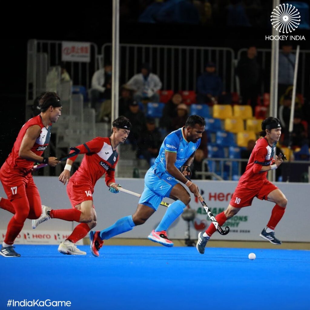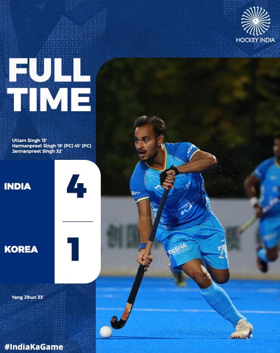 ஆட்டநேர முடிவில் 4-1 என்ற கோல் கணக்கில் இந்திய அணி வெற்றிபெற்று, இறுதிப்போட்டிக்கு முன்னேறியது. நாளை நடைபெறும் இறுதி ஆட்டத்தில் சீனாவுடன் இந்திய அணி மோதுகிறது.