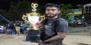 அப்போது அங்கு வந்த உறவினர்கள், நண்பர்கள் வாலிபால் விளையாட்டு வீரர் சவ பெட்டி மீது வாலிபால், அவர் பங்கேற்று வென்ற பரிசு கோப்பைகளை வைத்தவாறு உடலை சொந்தவூர் கொண்டு சென்றது மனதை உறுக்கும்விதமாக அமைந்தது.