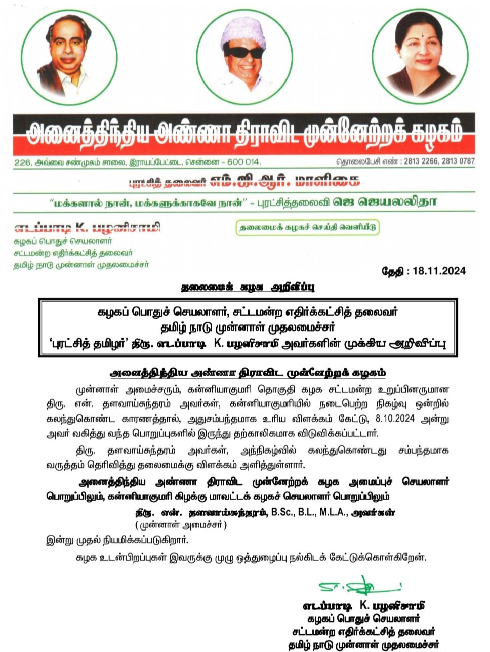 மேலும் அவர் வகித்து வந்த அதிமுக அமைப்புச் செயலாளர் மற்றும் கன்னியாகுமரி கிழக்கு மாவட்ட செயலாளர் பொறுப்புகளில் இன்று முதல் மீண்டும் நியமிக்கப்படுவதாக தெரிவிக்கப்பட்டுள்ளது.