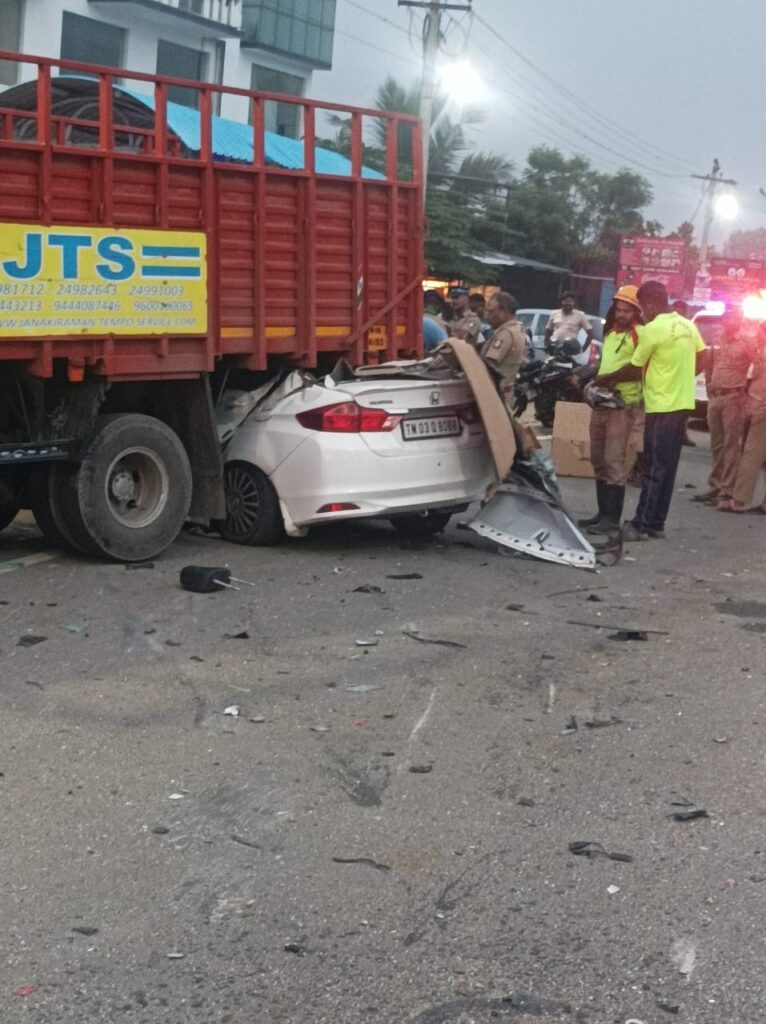 சென்னை கிழக்கு கடற்கரை சாலை கோவளம் அருகேயுள்ள செம்மஞ்சேரி குப்பம் பேருந்து நிலையம் அருகே ஈச்சர் லாரி ஒன்று பழுதாகி நின்றுகொண்டிருந்தது. அப்போது, மாமல்லபுரத்திலிருந்து சென்னை நோக்கி வந்த கார் ஒன்று எதிர்பாராத விதமாக சாலையோரம் பழுதாகி நின்றிருந்த ஈச்சர் லாரி மீது மோதியது.