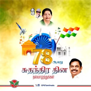 அதிமுக பொதுச்செயலாளர் எடப்பாடி பழனிசாமி வெளியிட்டுள்ள சமுக வலைதள பதிவில், இந்திய திருநாட்டின் 78வது சுதந்திர தினக் கொண்டாட்டத்தில், ஆங்கிலேயர் ஆதிக்கத்தை எதிர்த்து களம் கண்டு தியாகத்தின் விளைவாக நம் நாட்டிற்கு சுதந்திரம் பெற்றுத் தந்த விடுதலை வேள்விக்கொண்ட தீரர்களை நினைவுகூர்வதாக தெரிவித்துள்ளார்.