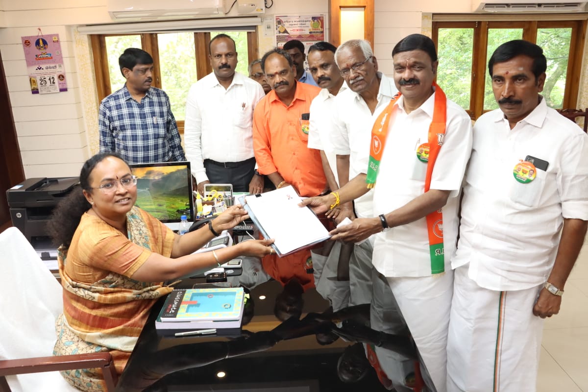 வேலூர் தொகுதியில் பாஜக கூட்டணி சார்பில் போட்டியிடும் A.C. சண்முகம் தேர்தல் நடத்தும் அலுவலரிடம் வேட்புமனு தாக்கல் செய்தார்.