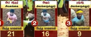 ஒவ்வொரு சுற்றுக்கும் 50 வீரர்கள் வீதம் மொத்தம் 9 சுற்றுகளாக போட்டிகள் நடைபெறுகிறது. தற்போதைய நிலவரப்படி, 6 சுற்றுகள் நிறைவடைந்தன. அதில் 21 காளைகளை அடக்கி சிவகங்கையை சேர்ந்த அபி சித்தர் முதலிடத்தில் உள்ளார். 16 காளைகளை அடக்கி அஜய்குமார் இரண்டாம் இடத்தில் உள்ளார். இதேபோல் 9 காளைகளை அடக்கில் அலங்கை என்ற ஊரைச் சேர்ந்த ரஞ்சித் மூன்றாவது இடத்தில் உள்ளார்.இதுவரை 378 காளைகள், 185 மாடுபிடி வீரர்கள் களம் கண்டுள்ளனர்.
