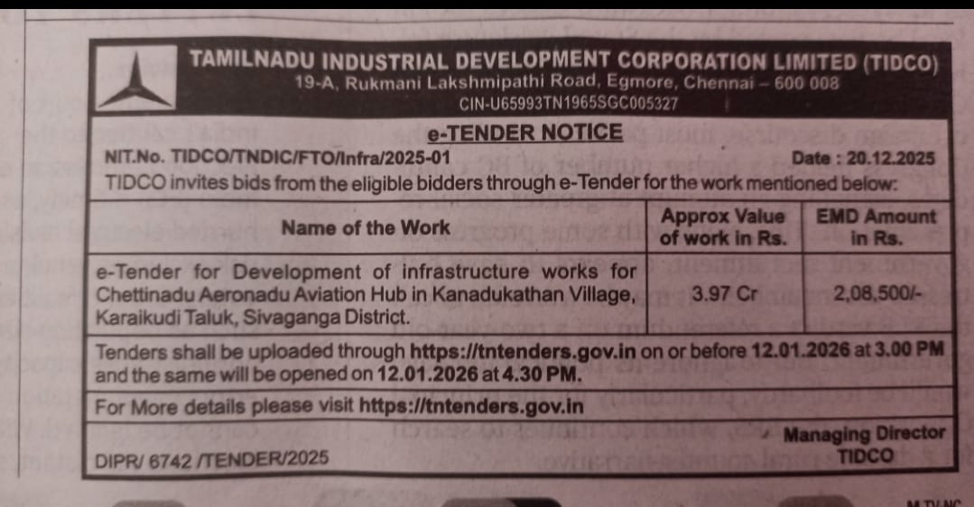 கரைக்குடியில் உள்ள செட்டிநாடு விமான நிலையத்தை விமானப் போக்குவரத்து மையமாக மாற்றுவதற்காக ரூ.3.97 கோடியில் கட்டமைப்பு பணிகளை மேற்கொள்ள தமிழக அரசு டெண்டர் வெளியிட்டுள்ளது.