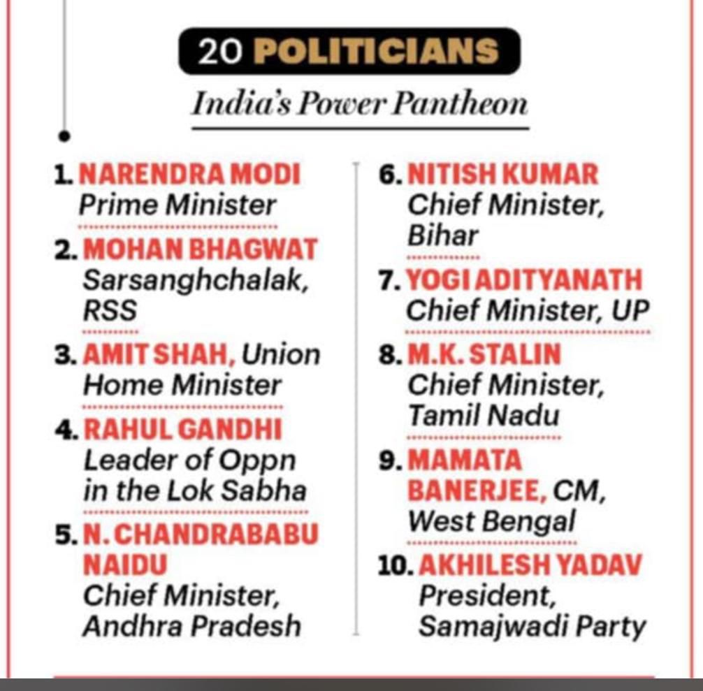 இந்த பட்டியலில் பிரதமர் மோடி முதல் இடத்தில் உள்ளார். ஆர்.எஸ்.எஸ். தலைவர் மோகன் பகவத் 2வது இடத்திலும், பாஜக தலைவர் அமித்ஷா 3வது இடத்தையும் பிடித்துள்ளனர். மக்களவை எதிர்க்கட்சித் தலைவர் ராகுல்காந்தி இப்பட்டியலில் 4வது இடத்தில் உள்ளார். இவை தவிர்த்து ஆந்திர முதல்வர் சந்திரபாபு நாயுடு, பிகார் முதல்வர் நிதிஷ்குமார், உத்தரபிரதேச முதல்வர் யோகி ஆதித்யநாத், மேற்குவங்க முதல்வர் மம்தா பானர்ஜி, சமாஜ்வாதி தலைவர் அகிலேஷ் ஆகியோரும் டாப் 10க்குள் இடம்பிடித்துள்ளனர்.