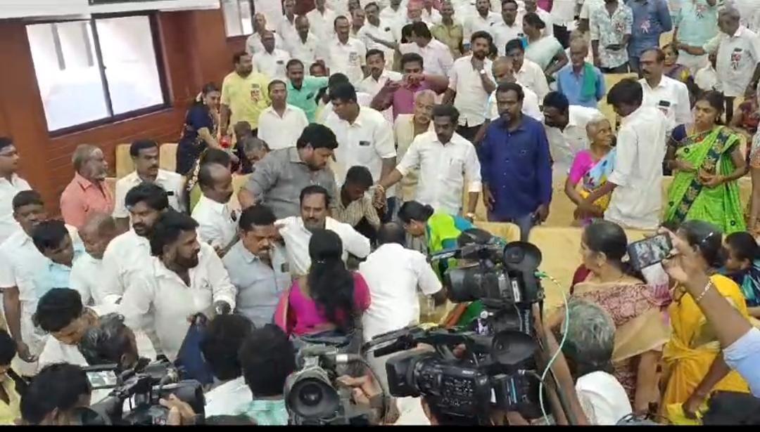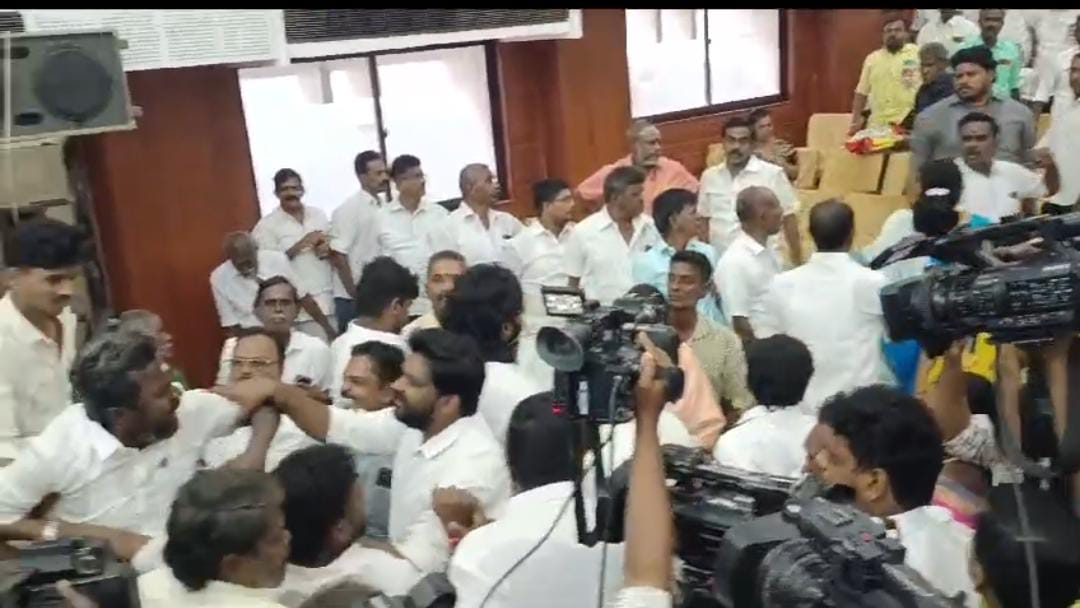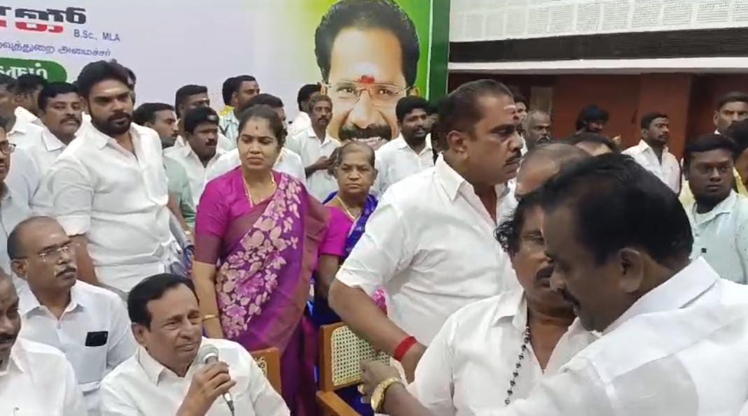 அப்போது, கட்சியில் இருந்து நீக்கப்பட்ட செழியன் என்பவர் மேடையில் ஏறி பேச முயன்றார். அதற்கு எதிர்ப்பு தெரிவித்து அதிமுக நிர்வாகிகள் அவர் மீது தாக்குதல் நடத்தி கீழே தள்ளியுள்ளனர். இதனால் ஆத்திரமடைந்த செழியன் ஆதரவாளர்கள், தாக்குதல் நடத்தியவர்களுக்கும் இடையே மோதல் ஏற்பட்டது. இதனால் அமைச்சர்கள் முன்னிலையில் ஒருவரை ஒருவர் சரமாரியாக தாக்கி கொண்டனர்.
