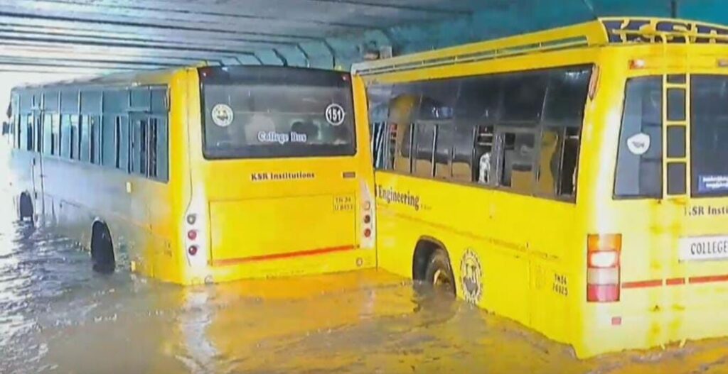 இந்த நிலையில், இன்று கா பள்ளிபாளையம் சுற்று வட்டார பகுதிகளில் கனமழை கொட்டித்தீர்த்தது. இதனால் காவேரி ஆர்.எஸ் பகுதியில் உள்ள ரயில்வே சுரங்கப் பாதையில் அதிகளவு மழைநீர் சூழ்ந்து கொண்டது. அப்போது, அந்த வழியாக வந்த 2 தனியார் கல்லூரி பேருந்துகள் மழைநீரில் சிக்கிக்கொண்டன.
