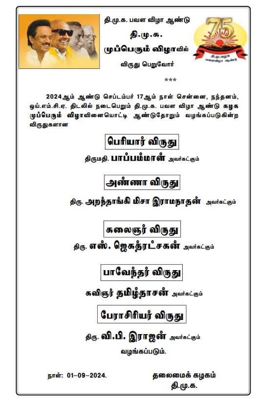 இது தொடர்பாக திமுக தலைமை கழகம் வெளியிட்டு உள்ள அறிவிப்பில், வருகிற செப்டம்பர் 17ஆம் தேதி சென்னை நந்தனம் ஒய்.எம்.சி.ஏ. திடலில் நடைபெறும்  தி.மு.க. பவள விழா ஆண்டு தி.மு.க. முப்பெரும் விழாவினையொட்டி ஆண்டு தோறும் வழங்கப்படும் பெரியார், அண்ணா, கலைஞர், பாவேந்தர், பேராசிரியர் விருதுகள் அறிவிக்கப்படுவதாக தெரிவிக்கப்பட்டு உள்ளது.