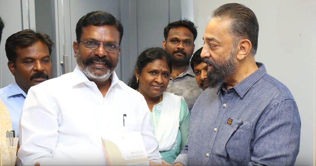 மாநிலங்களவை உறுப்பினராக பதவி ஏற்க உள்ள மக்கள் நீதி மையம் கட்சித் தலைவரும், நடிகருமான கமல்ஹாசனை சென்னை ஆழ்வார்பேட்டையில் உள்ள அவரது அலுவலகத்தில், விடுதலை சிறுத்தைகள் கட்சியின் தலைவர் திருமாவளவன் நேரில் சந்தித்து வாழ்த்து தெரிவித்தார். பின்னர் செய்தியாளர்களை சந்தித்த திருமாவளவன் பேசியதாவது:- மக்கள் நீதி மய்யம் தலைவர் கமல்ஹாசனை நேரில் சந்தித்து விடுதலை சிறுத்தைகள் கட்சியின் சார்பில் வாழ்த்துக்களை தெரிவித்தோம். மதச்சார்பற்ற முற்போக்கு கூட்டணியின் அங்கமாக இணைந்து கமல்ஹாசன் இயங்கி வருகிறார். திமுக சார்பில் மாநிலங்களவை உறுப்பினராக தேர்வாகி வரும் 25ஆம் தேதி பதவி ஏற்க உள்ளார். அந்த வகையில் அவரை மகிழ்ச்சியோடு வரவேற்று வாழ்த்தினோம். வரும் ஆகஸ்ட் மாதம் 17ஆம் தேதி எனது பிறந்த நாளையொட்டி சென்னையில் நடைபெறும் விழாவில் பங்கேற்கவும் கமல்ஹாசனுக்கு அழைப்பு விடுத்தோம். கமல்ஹாசன் தமிழுக்காகவும் தமிழ்நாட்டிற்காகவும் குரல் கொடுக்கும் பார்வை உள்ளவர். தேசிய அளவில் இணைந்து செயல்பட வேண்டிய தேவை குறித்தும், கருத்தியல் ரீதியாக உரையாடினோம்.