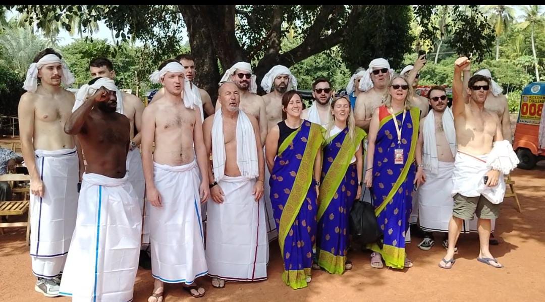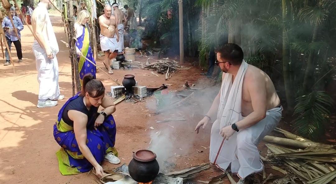 பாரம்பரிய முறையில் வேட்டி, சேலை அணிந்து பொங்கல் கொண்டாடிய வெளிநாட்டு சுற்றுலா பயணிகள்