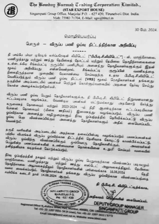 இது தொடர்பாக நிர்வாக தரப்பில் வெளியிட்டுள்ள அறிவிப்பில், தி பாம்பே பர்மா டிரேடிங் கார்ப்பரேஷன் லிமிடெட் (பி.பி.டி.சிமிமிடெட்) – ன். மாஞ்சோலை மணிமுத்தாறு மற்றும் ஊத்து தேயிலைத் தோட்டம் மற்றும் தேயிலை தொழிற்சாலைகளை உள்ளடக்கிய சிங்கம்பட்டி கருப்பில் பணிபுரியும் அனைத்து தொழிலாளர்களுக்கும் இதன் மூலம் அறிவிப்பது என்னவென்றால். சிங்கம்பட்டி நிலைதிருத்தமான முறையில் மேலாண்மை செய்வதற்கு உதவ குரூப்பின் வணிகத்தை வெளிப்படுத்தும் விருப்ப பணி ஓய்வு திட்டம் (VRS) மூலம் தொழிலாளர்கள் தங்களது பிபிடி.சி.பிமிடெட் தகுதியின் அடிப்படையில் பலன்கள் பெற்றுக் கொள்ளும்வகையில் அதனை தேர்வு செய்து கொள்ள அழைக்கப்படுகிறர்கள்.