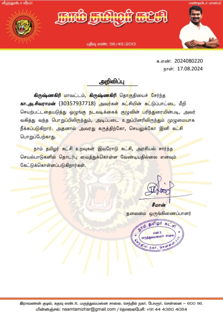 நாம் தமிழர் கட்சி உறவுகள் அவரோடு கட்சி அரசியல் சார்ந்த செயல்பாடுகள் தொடர்பு வைத்துக்கொள்ள வேண்டியதில்லை எனவும் கேட்டுக் கொள்ளப்படுகிறார்கள் என நாம் தமிழர் கட்சியின் தலைமை ஒருங்கிணைப்பாளர் வெளியிட்டுள்ள அறிக்கையில் தெரிவிக்கப்பட்டுள்ளது.
