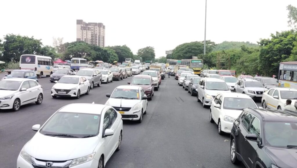 ஒரே நேரத்தில் ஆயிரக்கணக்கான வாகனங்கள் சென்னை நோக்கி வருவதால் பரனூர் சுங்கச் சாவடியில் 30 நிமிடங்களுக்கு மேலாக போக்குவரத்து நெரிசல் ஏற்பட்டுள்ளது. போக்குவரத்து நெரிசலை குறைக்க கூடுதல் பூத்கள் திறக்கப்பட்டு, வாகனங்கள அதிக அளவில் அனுப்பி வைக்கப்பட்டு வருகிறது.