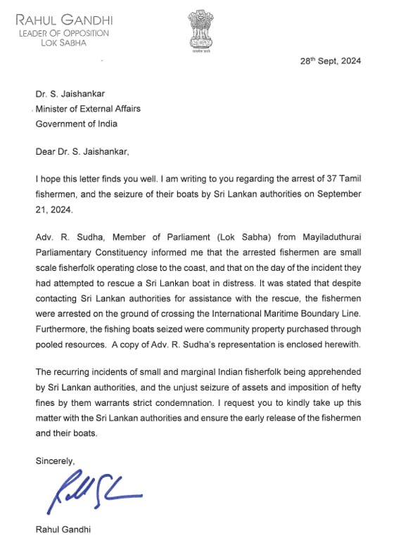 இலங்கை சிறையில் உள்ள தமிழக மீனவர்களை விடுவிக்க நடவடிக்கை எடுக்கக் கோரி மத்திய வெளியுறவு அமைச்சர் ஜெய்சங்கருக்கு, மக்களவை எதிர்க்கட்சித் தலைவர் ராகுல்காந்தி கடிதம் எழுதியுள்ளார்.