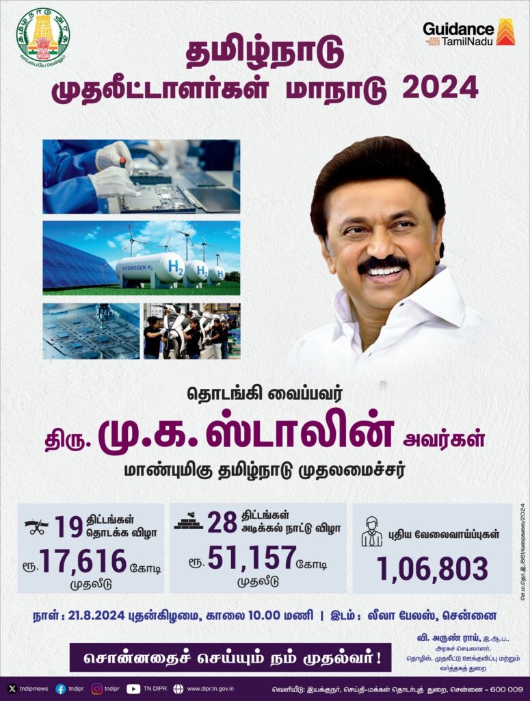 தமிழ்நாடு முதலீட்டு மாநாடு குறித்து நேற்று செய்தியாளர்களை சந்தித்த அமைச்சர் டி.ஆர்.பி. ராஜா 2021 – 23 ஆண்டுகளில் நடைபெற்ற உலக முதலீட்டாளர்கள் மாநாடு மற்றும் முதலமைச்சரின் வெளிநாட்டு பயணங்களின் மூலம் 19 நிறுவனங்கள் தொடங்கப்பட உள்ளதாகவும், இதனால் ரூ.17 ஆயிரத்து 616 கோடி முதலீடு கிடைக்கும் என்றும் தெரிவித்தார். ரூ.51 ஆயிரம் கோடி மதிப்பிலான புதிய திட்டங்கள் மற்றும் ஒட்டுமொத்தமாக ரூ.68 ஆயிரம் கோடிக்கான திட்ட பணிகளுக்கு இன்று முதலமைச்சர் மு.க.ஸ்டாலின் அடிக்கல் நாட்ட உள்ளதாகவும் அவர் குறிப்பிட்டார். இதன் மூலம் 1.06 லட்சம் பேருக்கு வேலை வாய்ப்பு கிடைக்கும் என்றும் அமைச்சர் டி.ஆர்.பி.ராஜா கூறினார்.