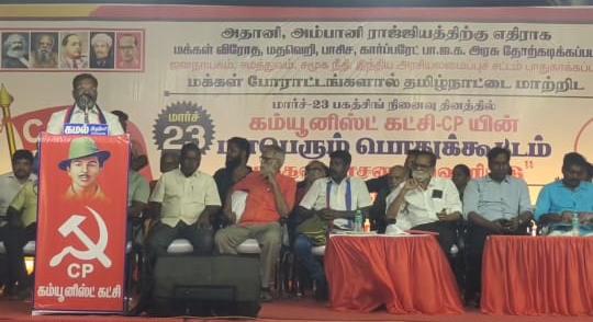 சென்னை அம்பத்தூரில் பகத்சிங் ராஜகுரு சுகதேவ் ஆகியோரின் நினைவு தினத்தினை முன்னிட்டு கம்யூனிஸ்ட் கட்சி சார்பில் மாபெரும் பொதுக்கூட்டம் அம்பத்தூர் அருகே கம்யூனிஸ்ட் கட்சியின் நாடாளுமன்ற நிலைபாடு மக்கள் சாசனம் அறிவிக்கும் பொதுக்கூட்டம் கட்சியின் ஆலோசகர் எஸ்.குமாரசாமி முன்னிலையில், மாநில அமைப்பு செயலாளர் கு.பாரதி தலைமை ஏற்பாட்டில் நிகழ்ச்சி நடைபெற்றது. இதில் விடுதலை சிறுத்தைகள் கட்சி தலைவர் திருமாவளவன் பங்கேற்று கம்யூனிஸ்ட் கட்சி மக்கள் சாசனம் எனும் கோரிக்கை நூலை வெளியிட்டார். இதனை தொடர்ந்து நிகழ்சியில் பேசிய திருமாவளவன் நாட்டில் வலது சாரிகள் வலிமை பெற்று வருகின்றனர். இது நாட்டிற்கும் ஜனனாயகத்திற்கும் பேராபத்து என எச்சரித்தார். மேலும் இவர்கள் மதத்தையும் மத உணர்வையும் அரசியல் ஆதாயத்திற்காக பயன்படுத்துவதாக குற்றம்சாட்டினர்.சாதிய வாக்கு வங்கி எனும் பல்வேறு அவதாரங்களில் அவர்கள் மக்களை ஏமாற்றும் வேலையை செய்து வருகின்றனர்.கடந்த 10 ஆண்டுகளில் பாஜக தனது இறுதி இலக்கை எட்டவில்லை. 2கோடி பேருக்கு வேலைவாய்ப்பு என கூறினார் ஆனால் வேலையின்மைதான் அதிகரித்துள்ளது என குறிப்பிட்டார்.மோடி இதுவரை வளர்ச்சி பற்றி பேசியதே இல்லை காங்கிரஸ் கம்யூனிஸ்ட் திமுக இவற்றை பற்றி பேசிதான் வாக்கு கேட்கிறார்.தாங்கள் கொடுத்த வாக்குறுதிகளை நிறைவேறிவிட்டது என மோடியால் பேச முடியுமா என கேள்வி எழுப்பினார்.தொடர்ந்து பேசுகையில் கடந்த மோடியின் 10 ஆண்டுகால ஆட்சியில் நாடு வளர்ச்சி அடையவில்லை கார்பரேட் தான் வளர்ச்சி எட்டியுள்ளது என குற்றம் சாடினார்.