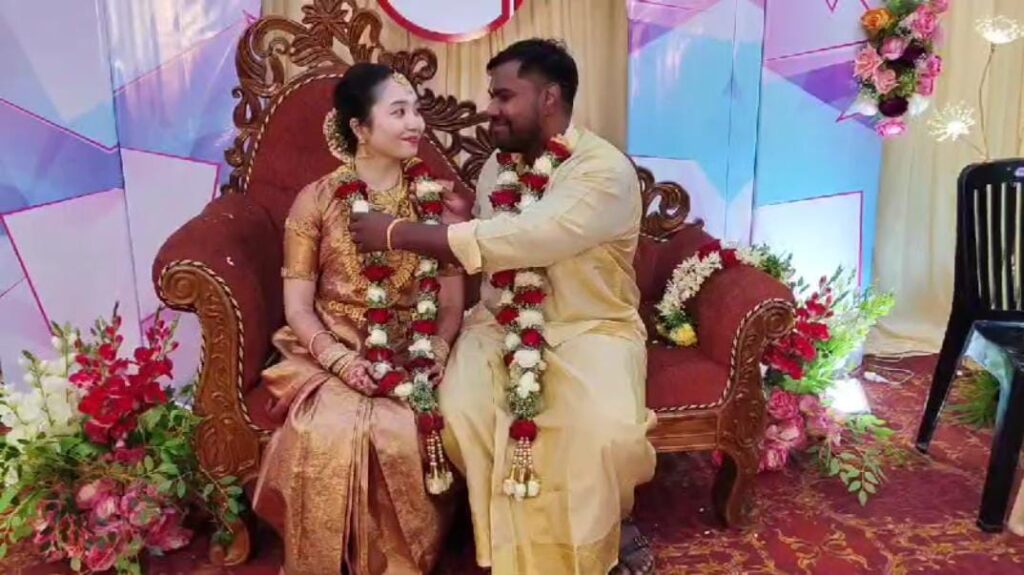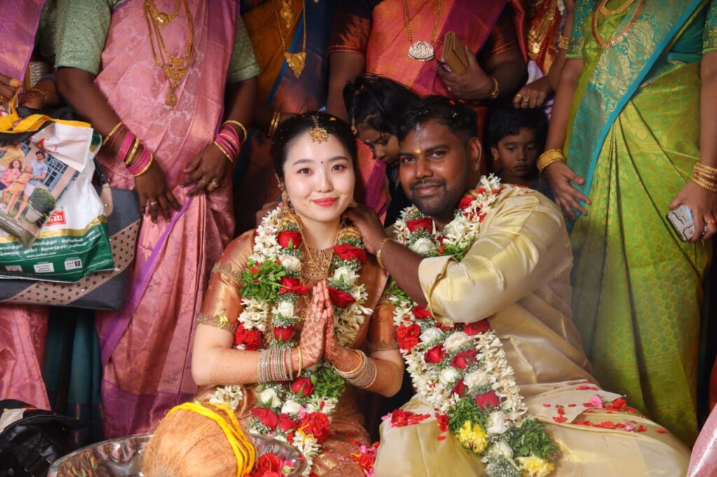 அப்போது ராஜேஷுக்கும், அதே நிறுவனத்தில் பணிபுரிந்து வந்த ஜப்பான் நாட்டைச் சேர்ந்த மியூகி என்ற பெண்ணும் காதல் ஏற்பட்டு, இருவரும் கடந்த ஓராண்டாக பழகி வந்துள்ளனர். இவர்களது காதலுக்கு பெற்றோர் பச்சைக் கொடி காட்டவே கடந்த 8 மாதங்களுக்கு முன் சென்னையில் இருவருக்கும் நிச்சயதார்த்தம் நடைபெற்றது. இந்நிலையில் நேற்று ராஜேஷ் – மியூகி ஆகியோரது திருமணம் தமிழ் முறைப்படி திருமழிசையில் உள்ள தனியார் மண்டபத்தில் விமரிசையாக நடைபெற்றது.