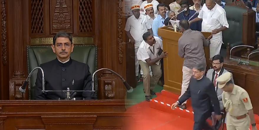 தமிழக அரசின் உரையை படிக்காமல் புறக்கணித்த ஆளுநர் ஆர்.என்.ரவி., தேசிய கீதம் பாடுவதற்கு முன்பே அவையில் இருந்து வெளியேறினார்.