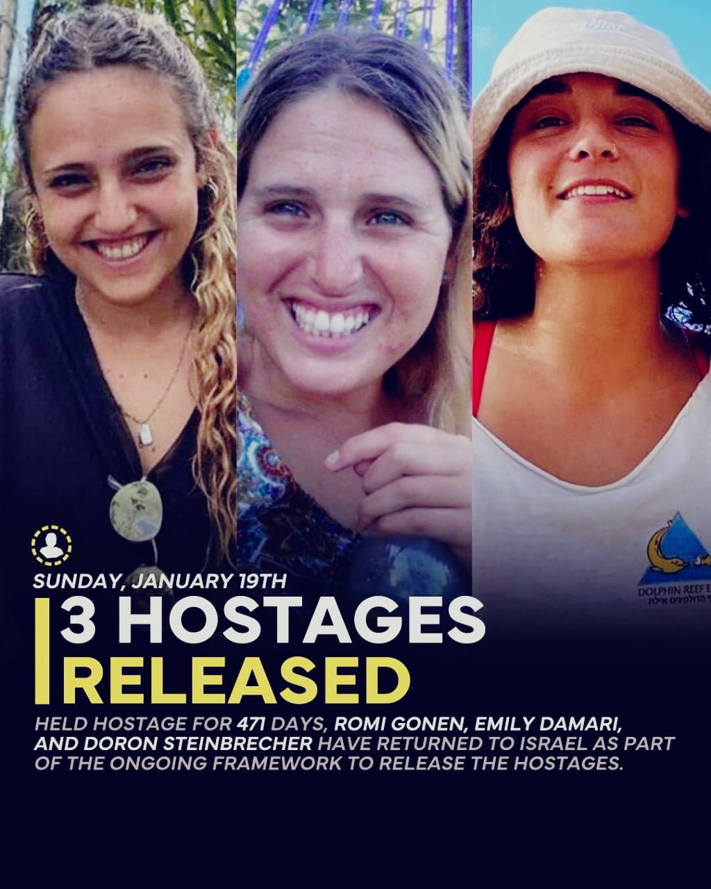 இதனை தொடர்ந்து, ஹமாஸ் அமைப்பினர் 3 பணய கைதிகளையும் கார் மூலம் அழைத்து வந்து, செஞ்சிலுவை சங்கத்தினரிடம் ஒப்படைத்தனர். அப்போது ஹமாஸ் இயக்கத்தினர் திரண்டு ஹமாஸ் என முழக்கங்களை எழுப்பினர். இந்நிகழ்வை இஸ்ரேல் தலைநகர் டெல் அவிவ் நகரில் ராட்சத திரையில் பல்லாயிரக்கணக்கானோர் கண்டு மகிழ்ச்சி அடைந்தனர். இதனை தொடர்ந்து, விடுவிக்கப்பட்ட 3 பணய கைதிகளும் இஸ்ரேல் பாதுகாப்பு படையினரிடம் ஒப்படைக்கப்பட்டனர். அவர்கள் மருத்துவ பரிசோதனைக்கு பின்னர் குடும்பத்தினரிடம் ஒப்படைக்கப்பட உள்ளதாக அதிகாரிகள் தெரிவித்துள்ளனர். இதற்கு பதிலாக 19 பதின் பருவத்தினர் உள்பட 90 பாலஸ்தீனியர்களை இஸ்ரேல் விடுதலை செய்தது.