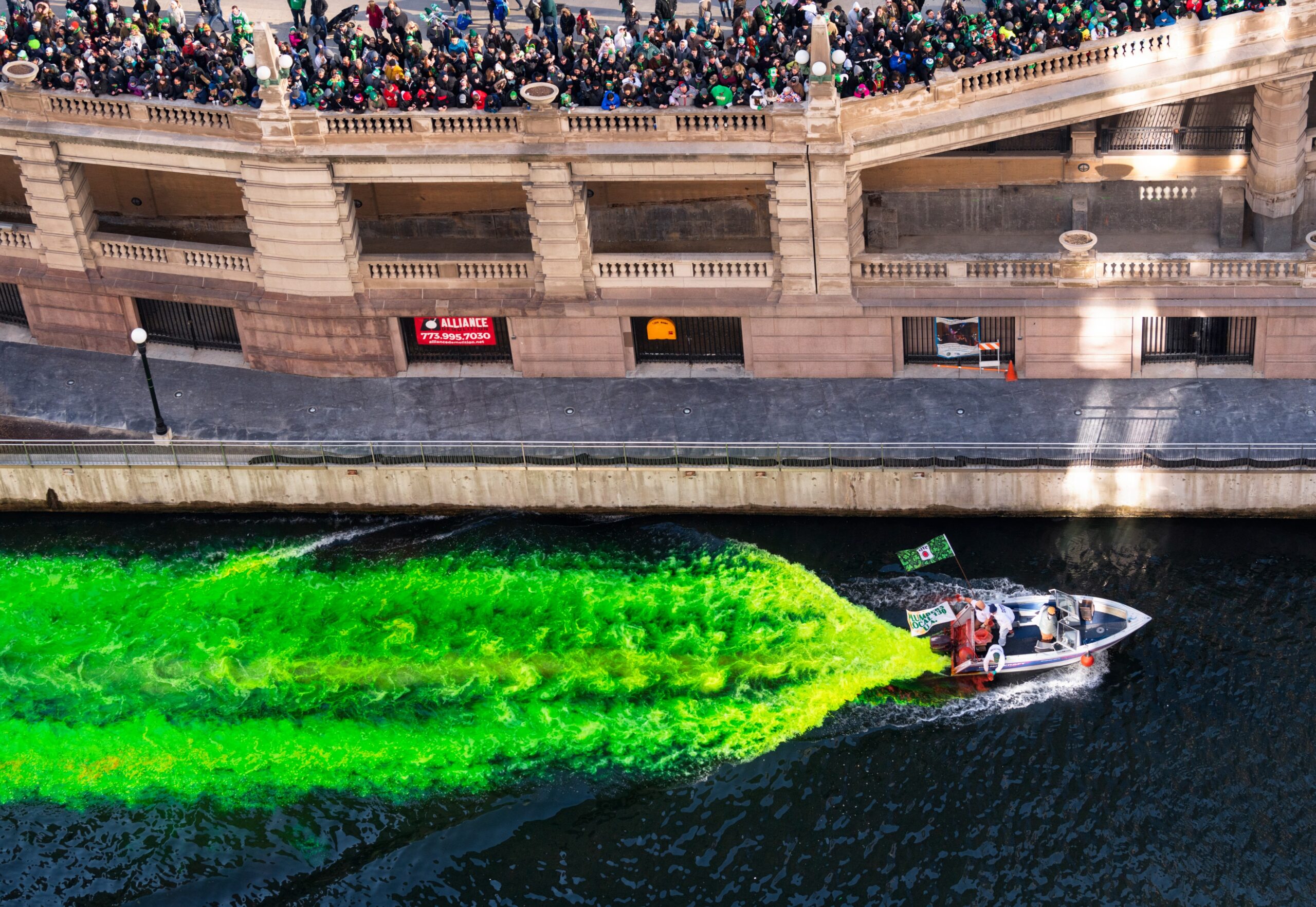 செயின்ட் பாட்ரிக் தினத்தை முன்னிட்டு, சிகாகோவில் பளீர் பச்சை நிறத்தில் காட்சியளித்த ஆற்றில் ஏராளமானோர் படகு சவாரி செய்து மகிழ்ந்தனர்.