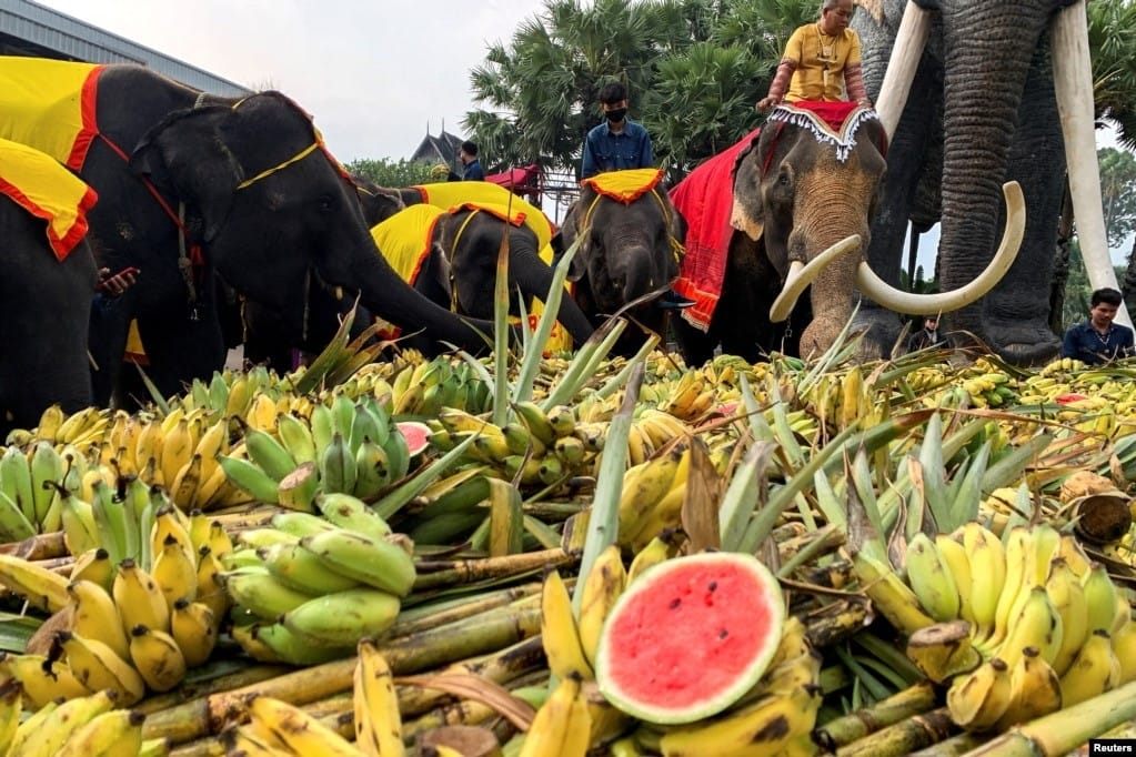 பண்டைய காலம் தொட்டு தாய்லாந்து கலாச்சாரத்தில் யானைகள் முக்கிய பங்காற்றிவருவதால், ஆண்டுதோறும் தேசிய யானைகள் தினத்தை அந்த நாட்டு மக்கள் கொண்டாடிவருகின்றனர். நடப்பாண்டும் அங்கு யானைகள் தின விழா களைகட்டியது. சோன்புரி மாகாணத்தில் உள்ள பிரசித்தி பெற்ற நோங் நூச் பூங்காவில், புகழ்பெற்ற யானை சிலைக்கு முன்பாக கொண்டாட்டம் நடைபெற்றது. 26 அடி நீள மேஜையில், 3 டன் பழங்களும், காய்கறிகளும் 60 யானைகளுக்கு விருந்தாக பரிமாறப்பட்டன.